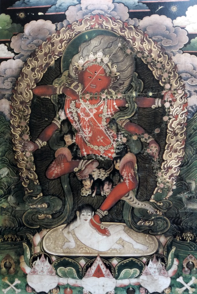 The fierce female divinities depict the aspects of kundalinî or the final forms of unifying energy within, often terrible to experience. “[S]he has a dramatic, passionate persona as she dances in a wreath of flames. Her facial expression is one of intensity and ferocity, expressing a single-minded and uncompromising focus on ultimate truth and liberation.” (Menzies: Goddess – Divine Energy, p.208)